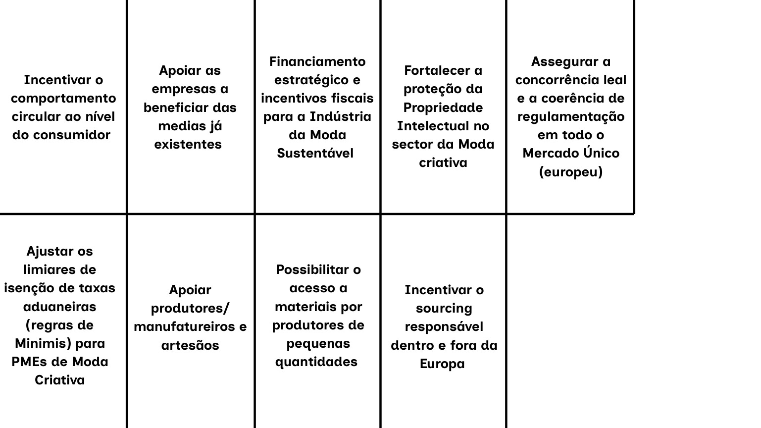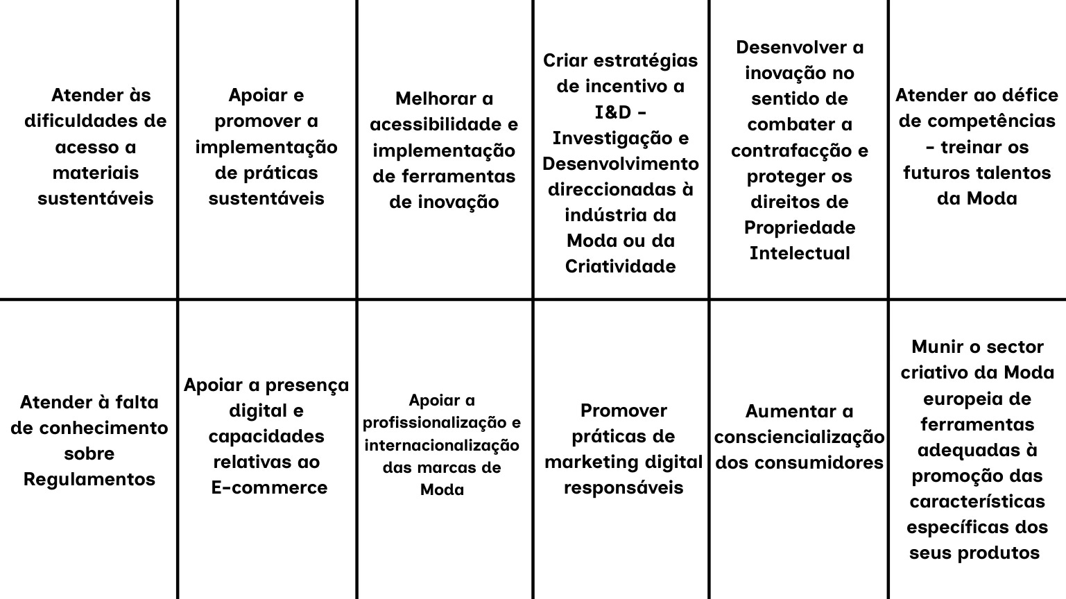 As 63 recomendações feitas e resumidas pela própria EFA, atendendo ao sector criativo da Moda, são as seguintes: