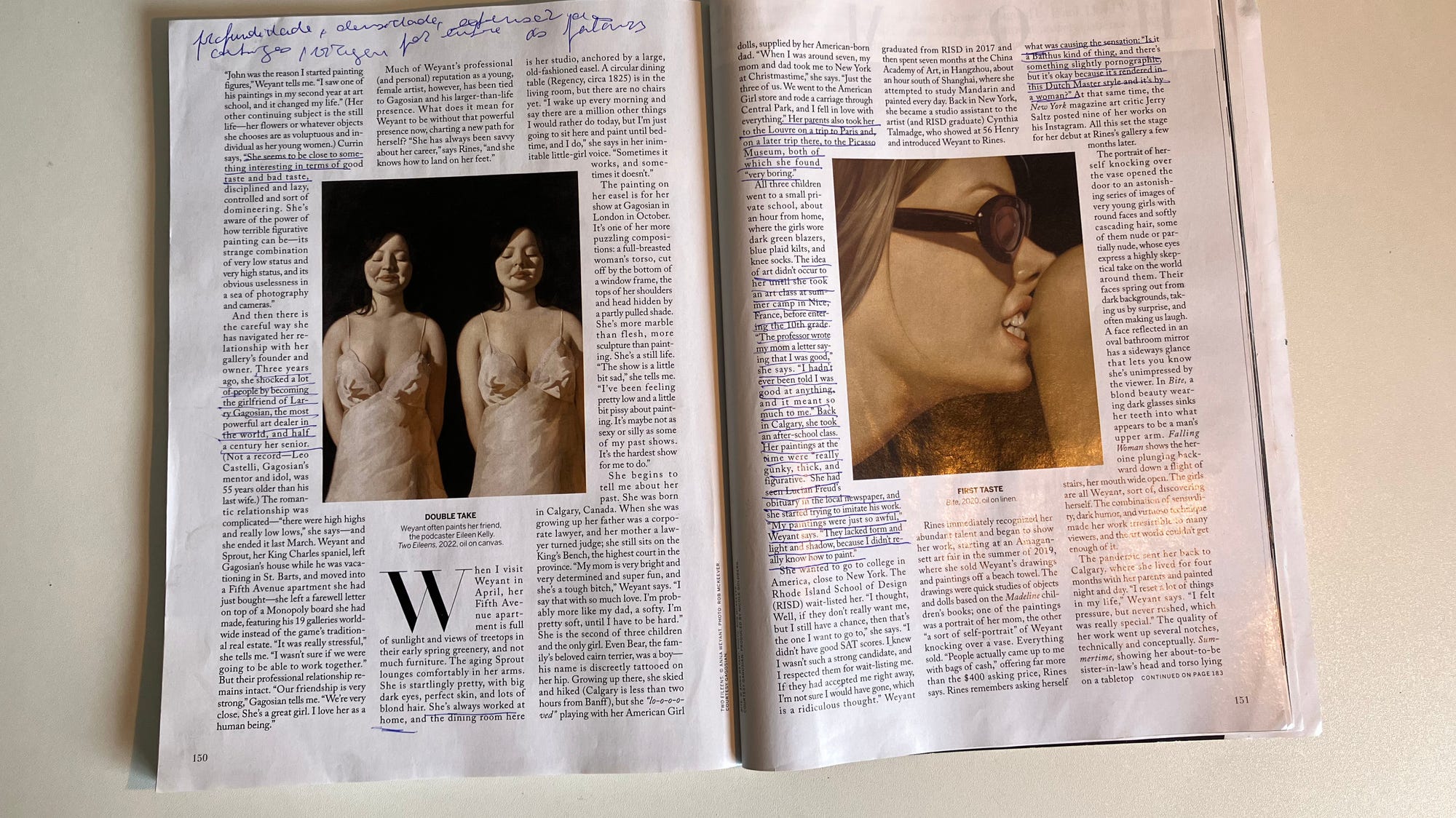 Quem disse que a Vogue não pode inspirar a pintura? A pintura foi tida com uma “arte maior”, é mais clássica. Mas com Weyant tudo é um pouco diferente, a Vogue e o respectivo imaginário inerente sempre tiveram tal influência tamanha no seu trabalho que as telas que utiliza obedecem às mesmas proporções que as capas da Vogue.